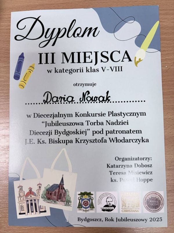 W ubiegłym tygodniu odbyło się rozdanie nagród konkursu plastycznego ,,Jubileuszowa Torba Nadziei Diecezji Bydgoskiej”. Ogromny sukces Darii Nowak Ill miejsce, podziękowanie za udział dla Oliwii Arkuszewskiej. Uczniów do konkursu przygotowała p. Kamila Marosz.