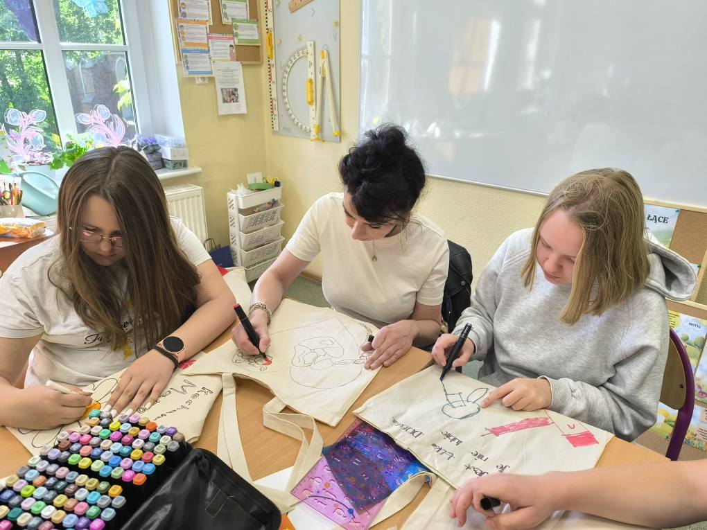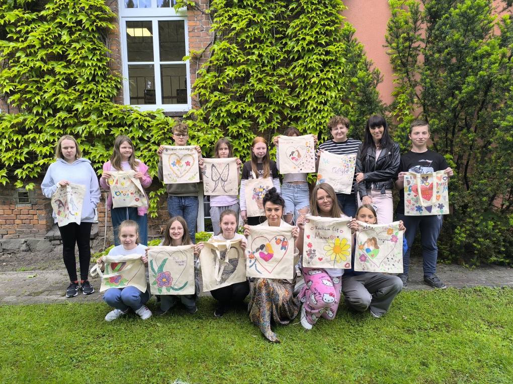 Warsztaty artystyczne z panią Ewą Hałas- prezenty dla MAM. Uczniowie zrobili torby płócienne na zakupy. W zajęciach brali udział uczniowie z różnych klas. Organizatorki, p. Joanna i p. Aleksandra.